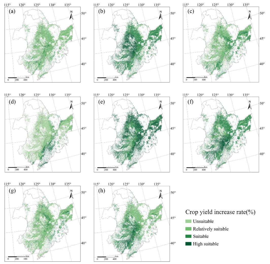 图3 东北黑土区不同土壤管理方式下作物产量适宜性及空间分布