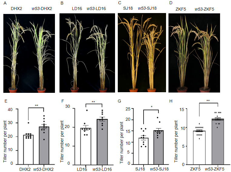 东北地理所水稻分子育种团队近年来一直探索OsWRKY53的生物学功能,前期研究已报道,OsWRKY53通过油菜素内酯(BR)信号通路调控株高和叶角;也参与负调控水稻的孕穗期耐冷性。多年多点的田间试验表明,不同背景下的oswrky53材料均表现半矮化、多分蘖的理想株型,展现出一种具有重要应用潜力的优良性状组合(图1)。