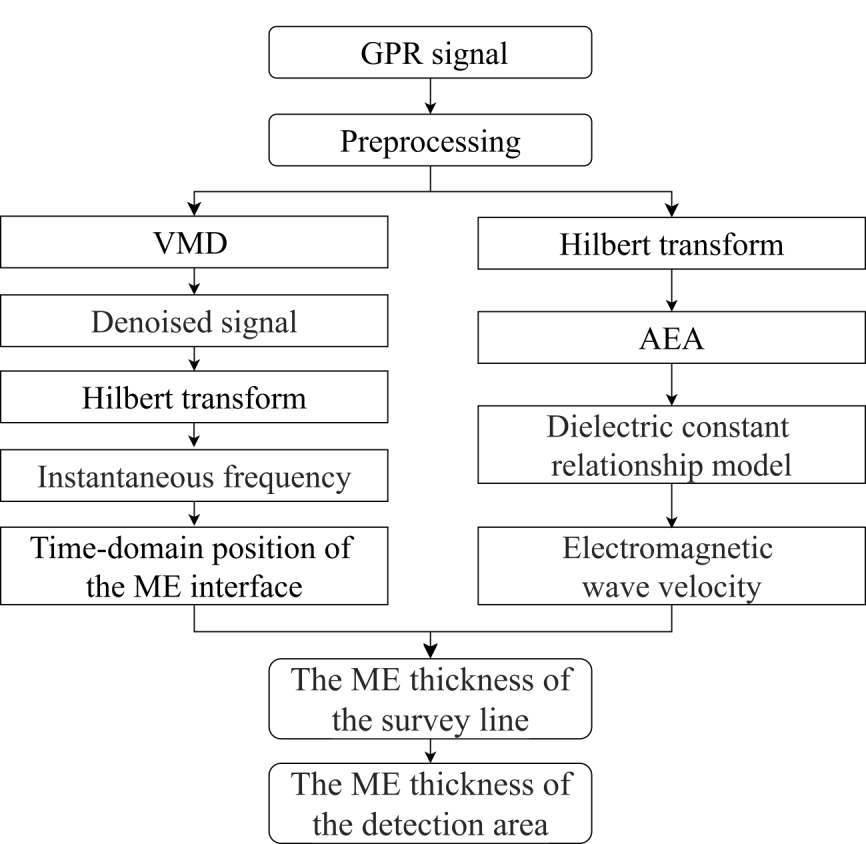 针对上述问题,中国科学院东北地理所土壤资源与利用学科组科研人员提出了一种基于变分模态分解(VMD)与振幅包络平均值(AEA)相结合的GPR信号处理方法(VMD-AEA)。该方法创新性地通过中心频率与瞬时频率标准差双准则自动筛选VMD分解出IMF分量降低GPR信号的噪声干扰,再利用希尔伯特变换提取去噪信号的瞬时频率,最后通过峰值检测捕捉瞬时频率的最大值,实现黑土层分界面的自动定位;通过AEA法构建黑土层介电常数模型,反演测线方向的介电常数,从而获取电磁波波速,最终实现黑土层厚度的自动获取(图1)。